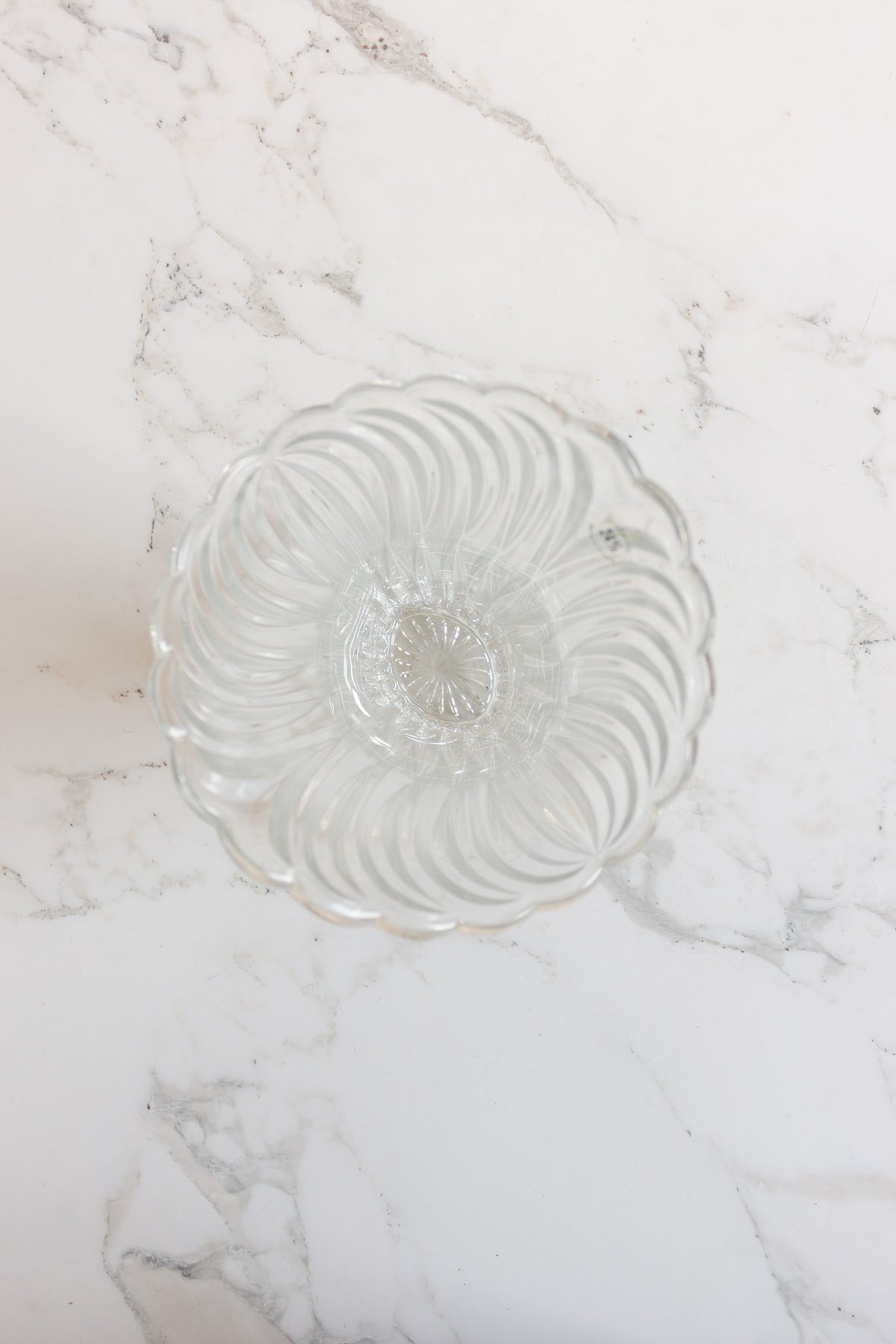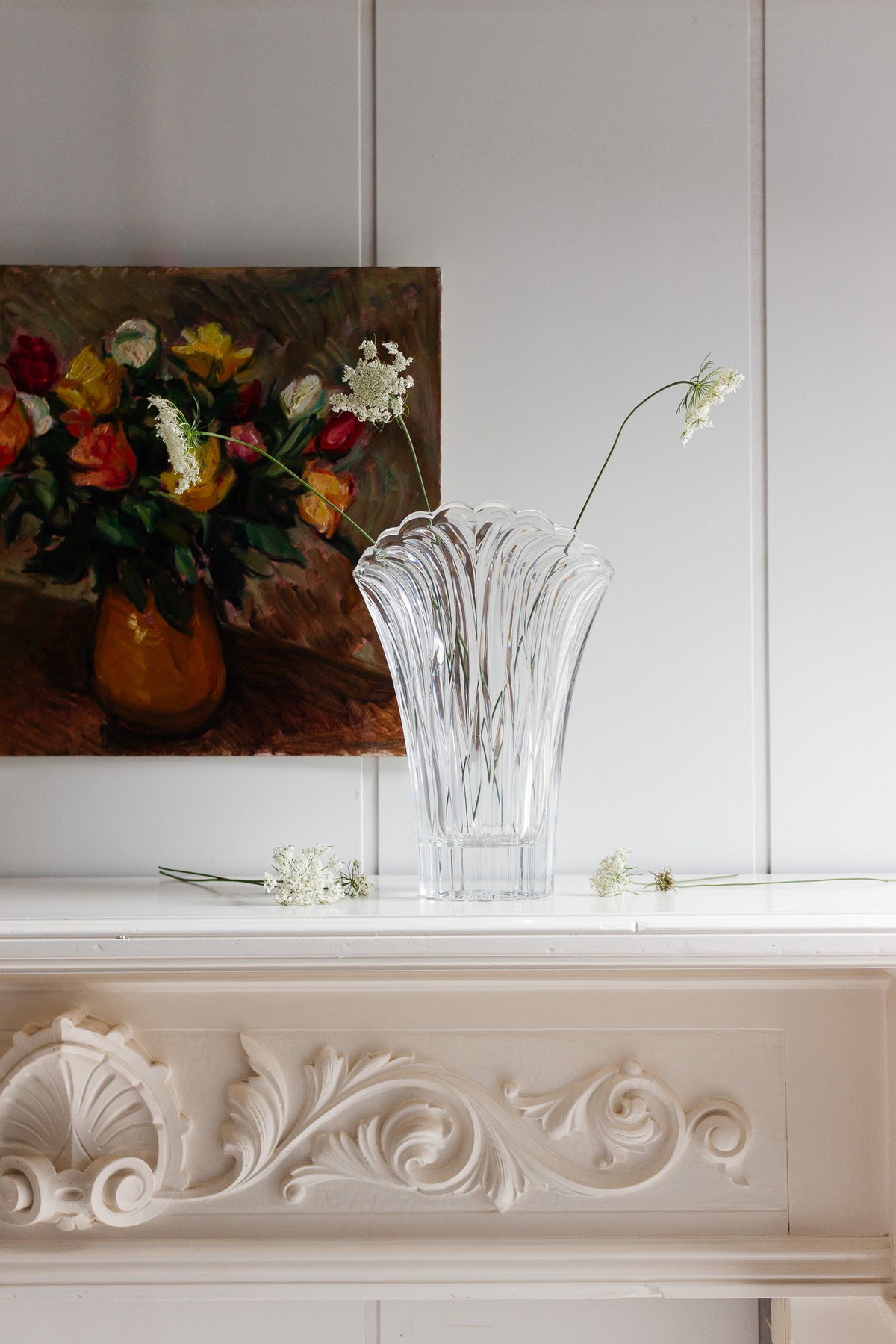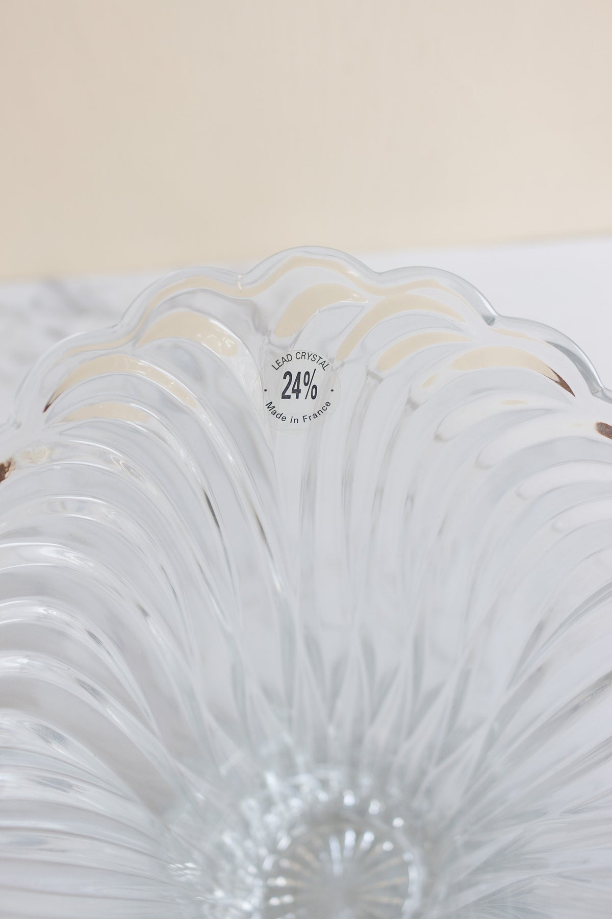 Heavy vintage French Cristal d’Arques flared vase, weighing nearly 5 lbs, with scalloped top edges that catch the light beautifully. Sourced from a brocante in Marseille, its sparkling clarity makes it a showstopper for any bouquet.