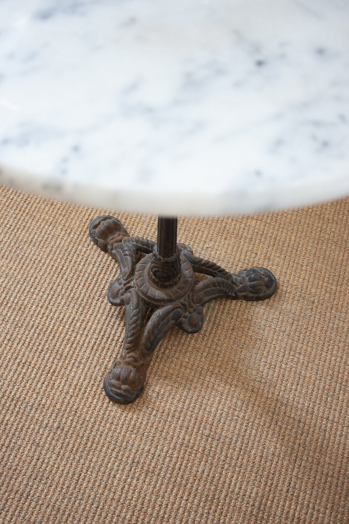 Picture this bistro table on a restaurant patio in the streets of Marseille. The gorgeous marble top sits atop a beautifully weathered cast iron base. We love the patina and age of this table, that is in excellent vintage condition. Sourced from a brocante in Marseille.