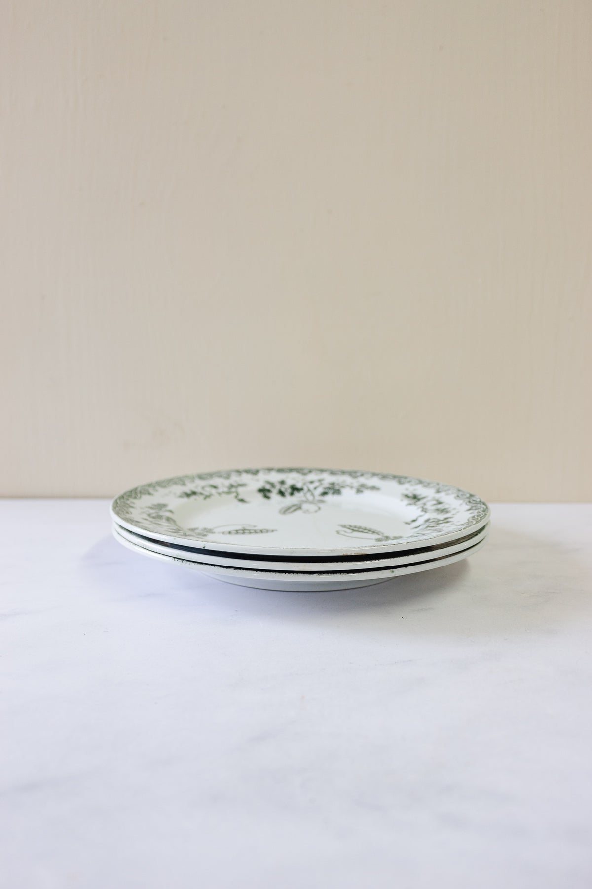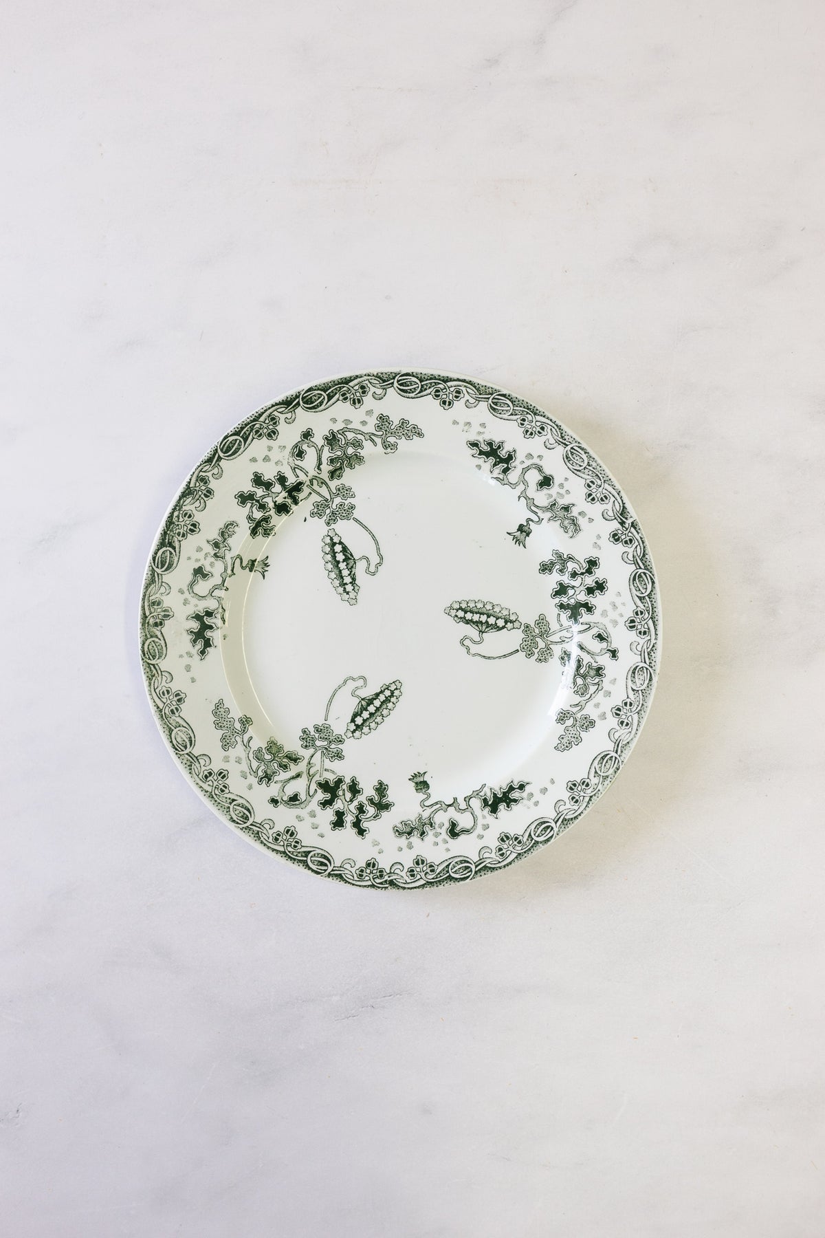 A lovely set of dinner plates from the 1900s, with a sweet green transferware design, add them to your collection of vintage and antique tableware. Create an eclectic dinner ware set or use them as petite serving dishes.