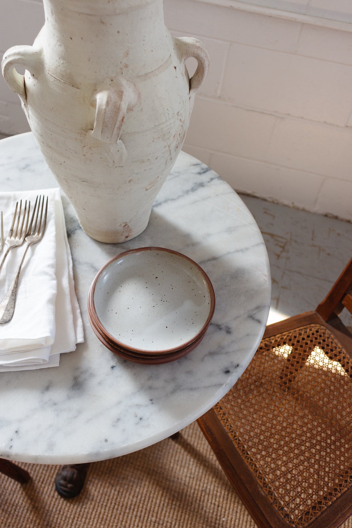 This set of six beautiful vintage french stoneware plates were found in a home in Arles, boxes and completely unused. We love their neutral coloirs and their perfect heavy weight.