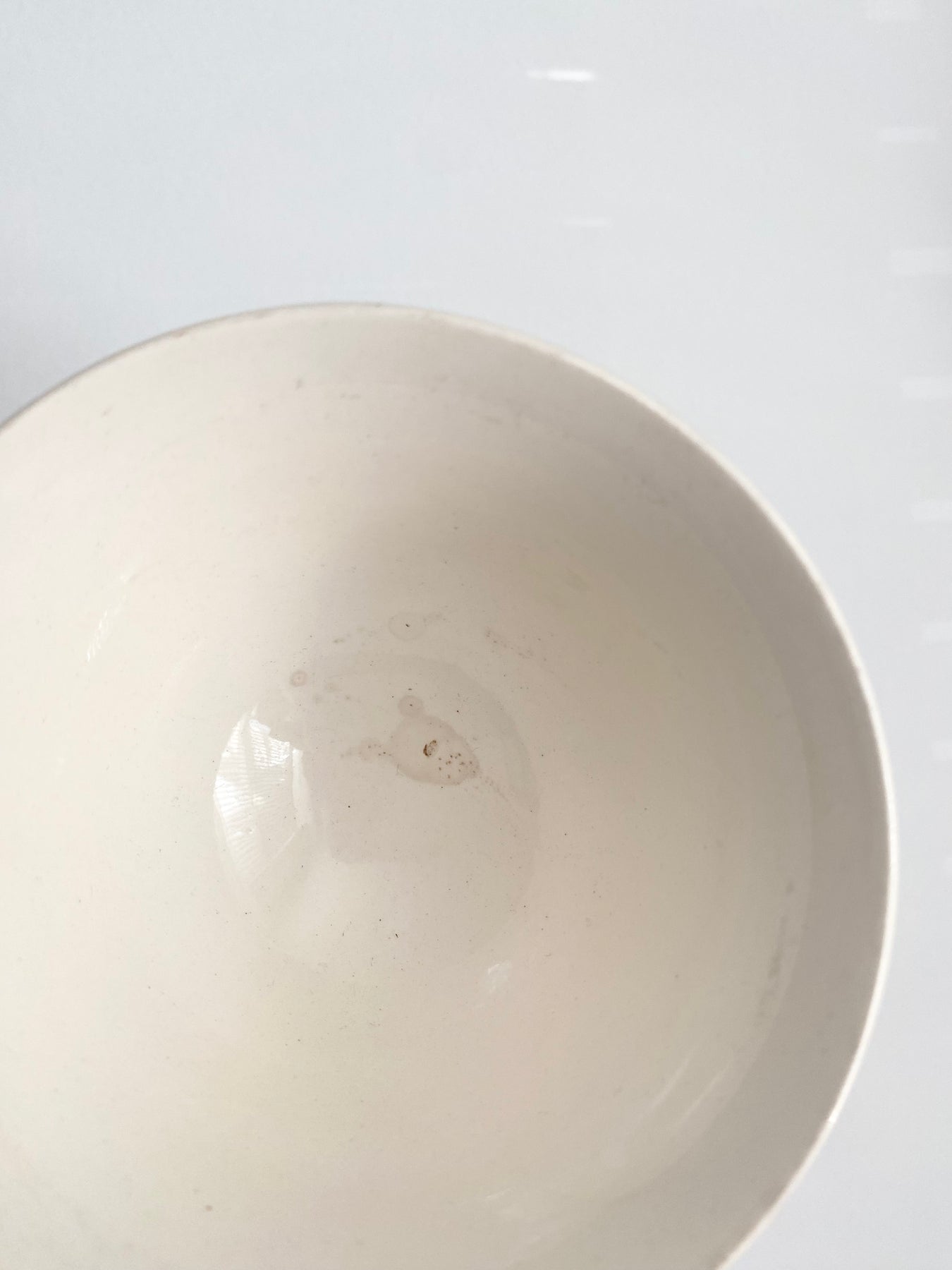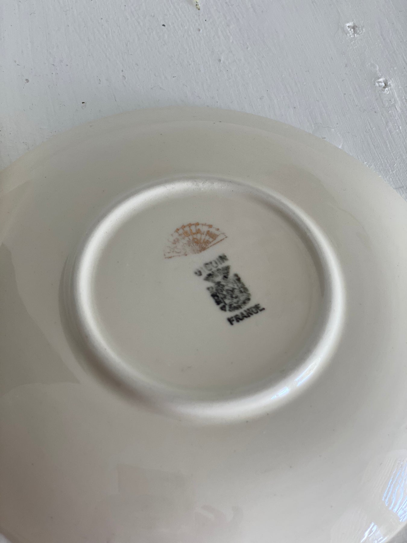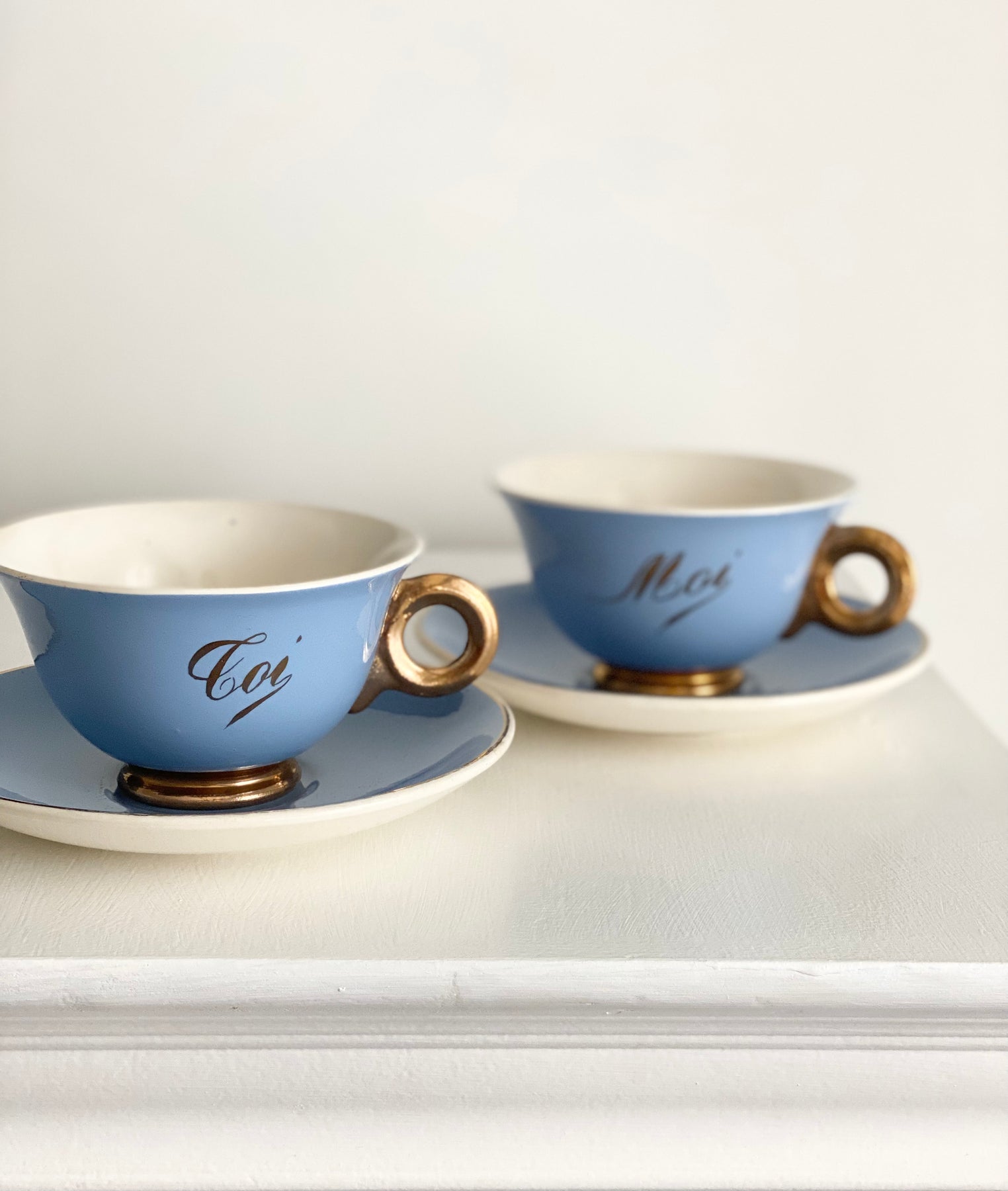 These sweet breakfast sets are popular in France, and you can find them in wide range of styles, but many that we’ve come across are common, newer in production or mass produced. This set, however, caught our eye: a pair made by Digoin Sarreguemines, in the most incredible cerulean blue with gold accents, cunning circular handles, and the "toi" and "moi" hand painted in the most stunning cursive font.  This sweet set is in beautiful  condition with no chips or cracks. Please note one of the cups has some staining on the interior as pictured, and some of the gold along the rim of the plates shows slight wear.