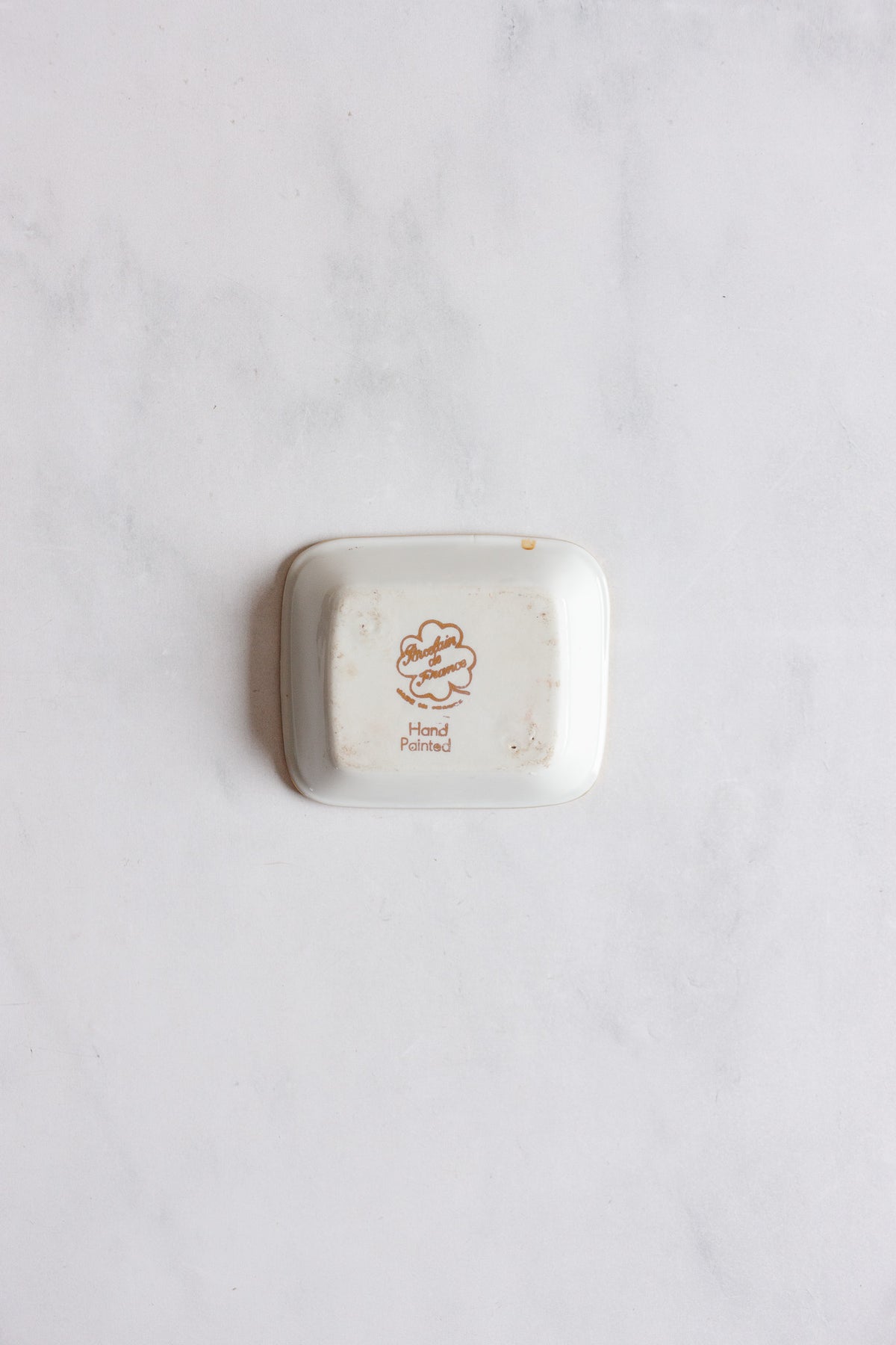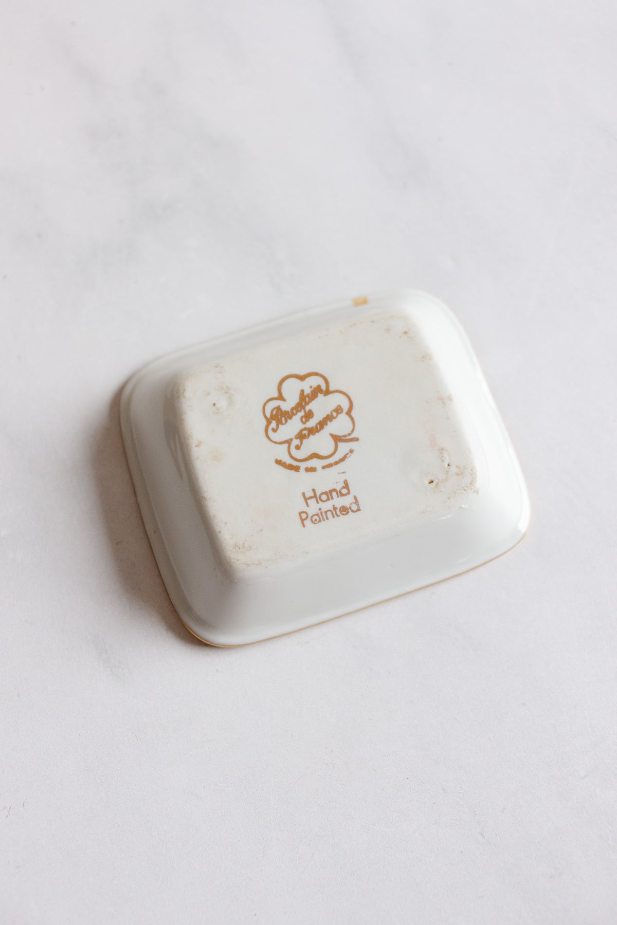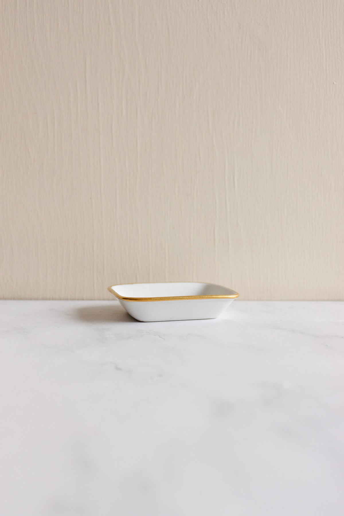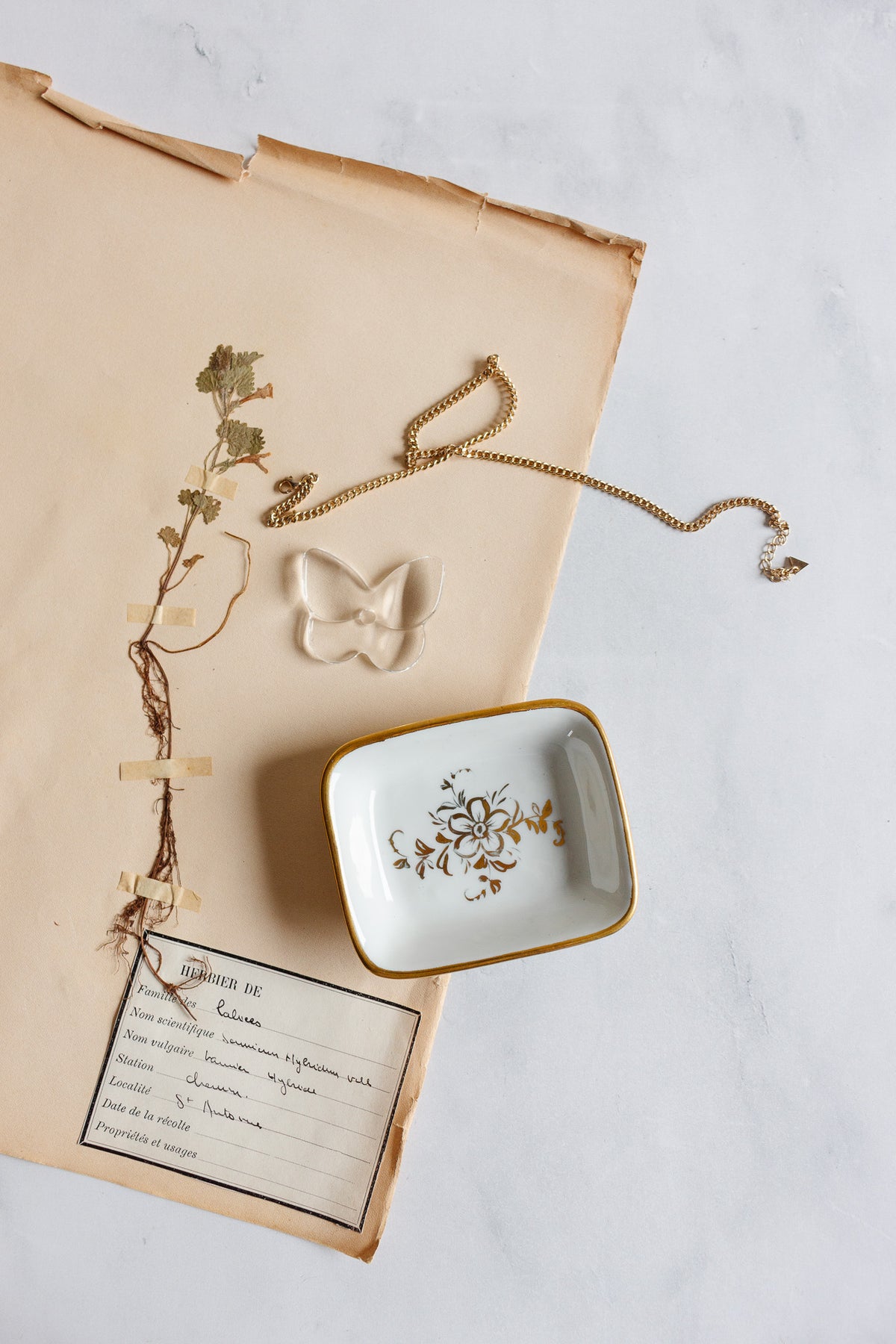 A sweet vintage French catch all dish made of white porcelain and decorated with gold detailing. Perfect to add to a cabinet of curiosities, or use for jewelry and keepsakes. Sourced from a brocante in Marseille. Sold individually.