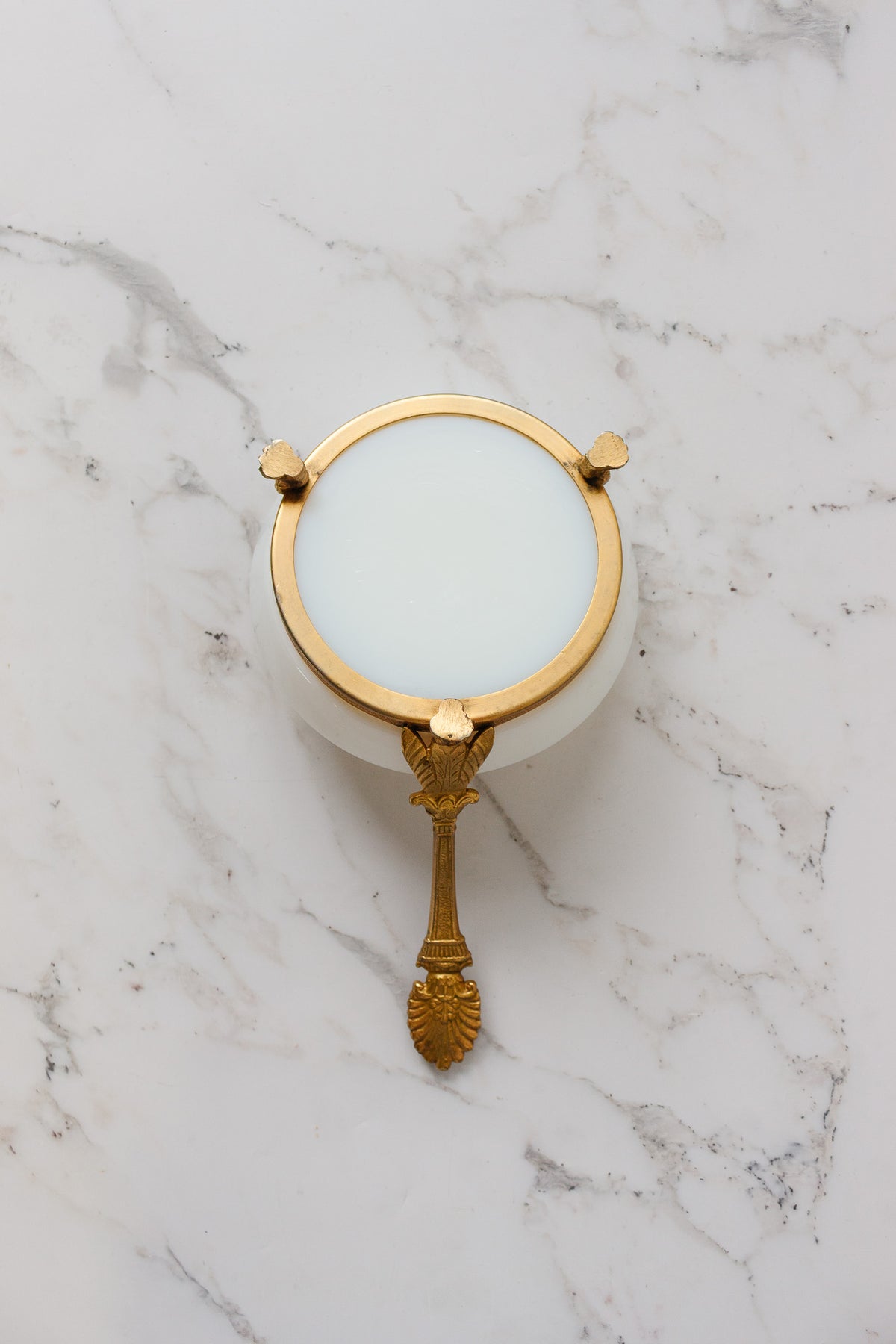 This exquisite antique French dish pairs a rich bronze framework with a “bulle de savon” opaline glass insert—so named for its lustrous, soap-bubble–like translucence. Dating to the Belle Époque or early 20th century, the bronze rim is finely chased with scrolling foliate motifs, while the opaline bowl offers a soft, milky glow that beautifully diffuses light. Use it as an elegant catchall on a vanity, a delicate fruit or candy dish, or simply as a centerpiece to showcase its harmonious blend of materials and timeless French artistry.