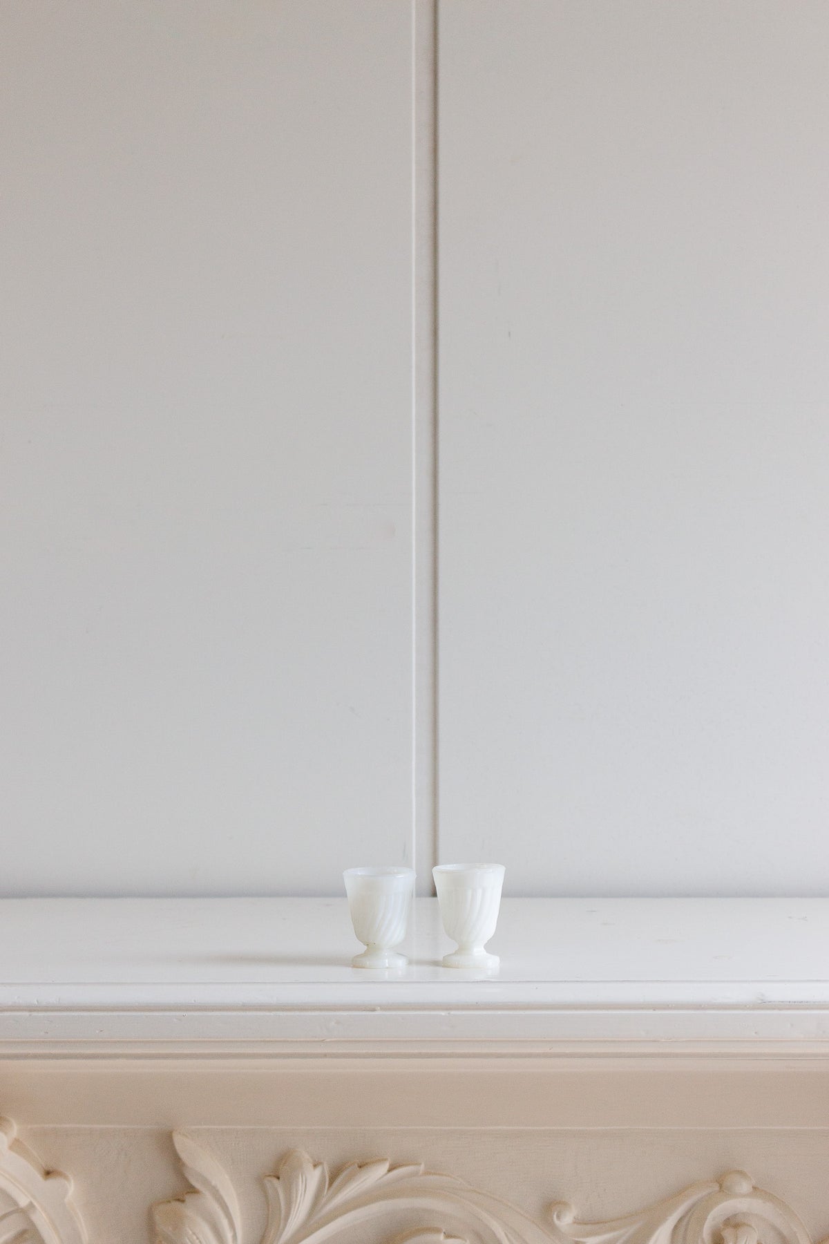 This petite pair of vintage French milk glass cups features a soft, opaque white finish and simple, rounded form. Sourced from a brocante in Marseille, they were likely used as café or bistro serving pieces, but lend themselves beautifully to modern use—perfect for toothpicks, rings, or tiny collected curiosities. A subtle, versatile addition to any vignette.