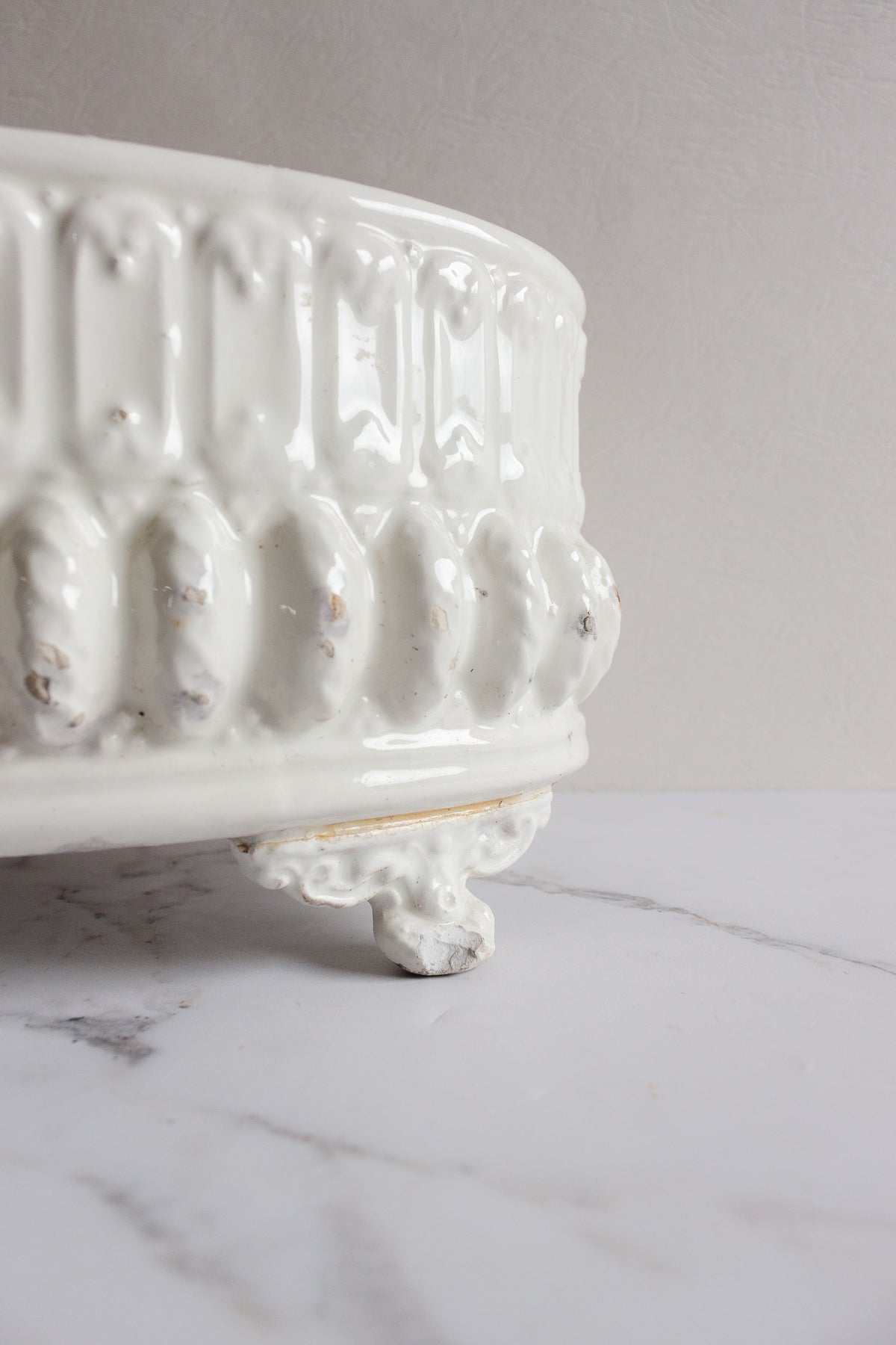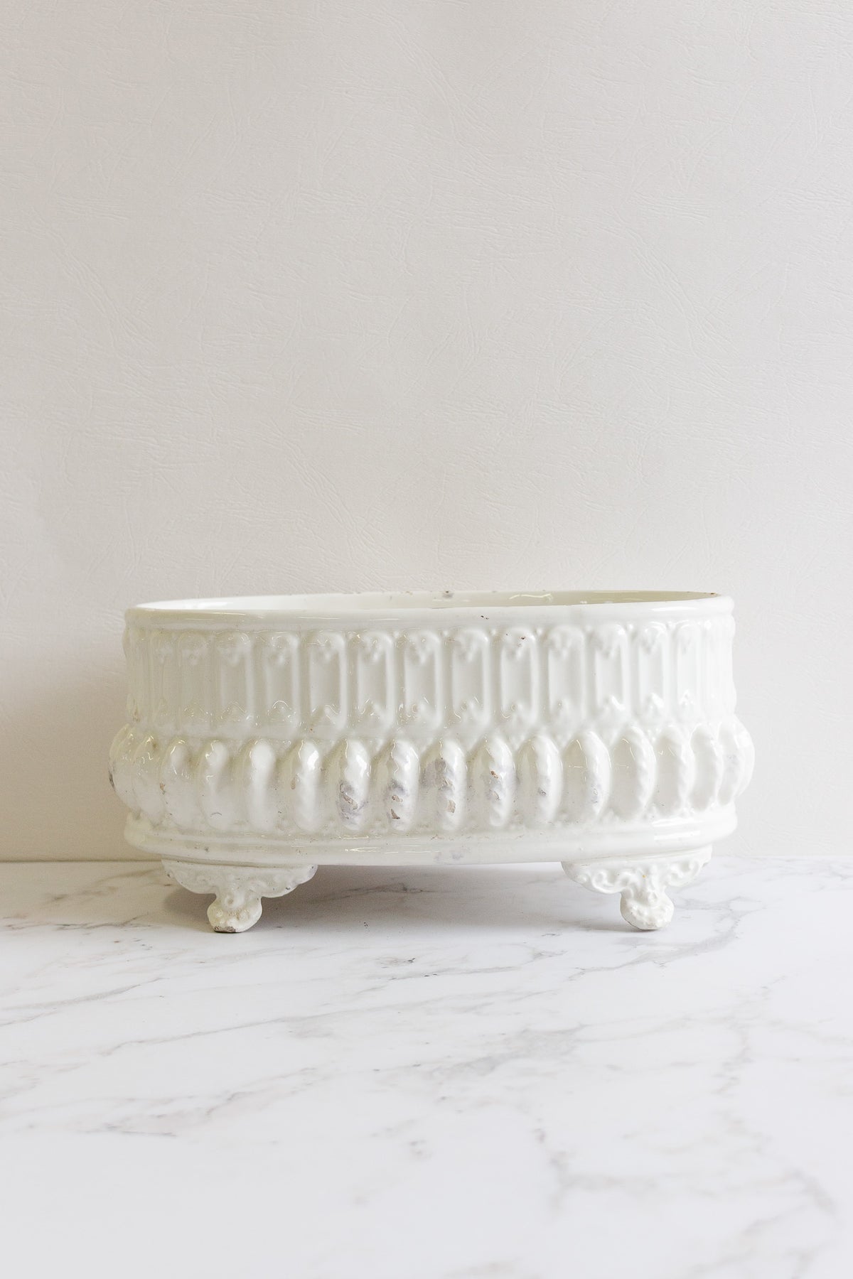This antique spanish porcelain jardinière is a refined oval piece with beautifully detailed decoration and elegant form. Sourced from an estate in Marseille, it remains in excellent condition—ideal for displaying fresh blooms or standing alone as a decorative accent.