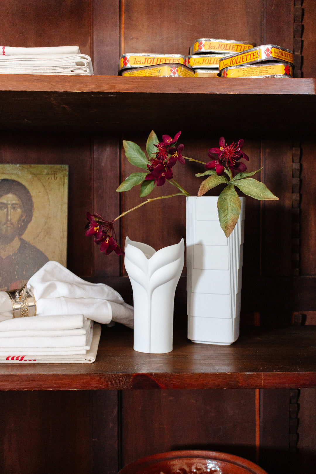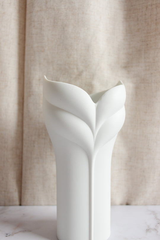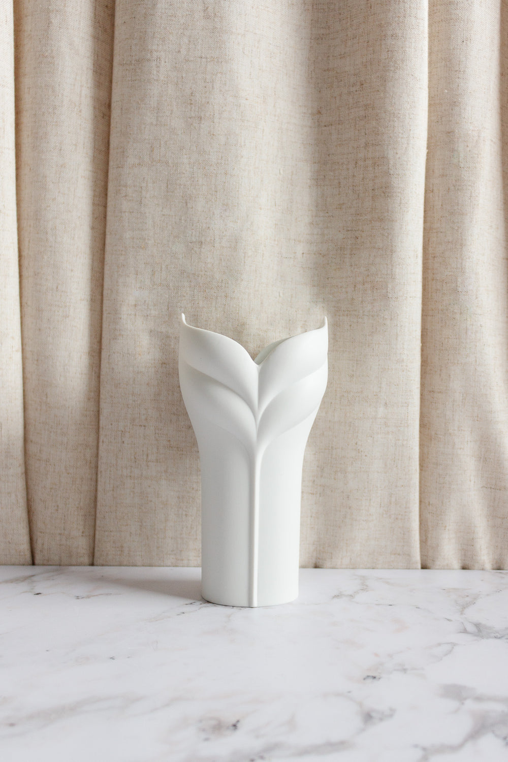 The calla lily bisque vase was made by Ute Feyl for Rosenthal, Germany. Uta Feyl was born in the Czech Republic and educated in Berlin. She started designing objects for Rosenthal in 1979.