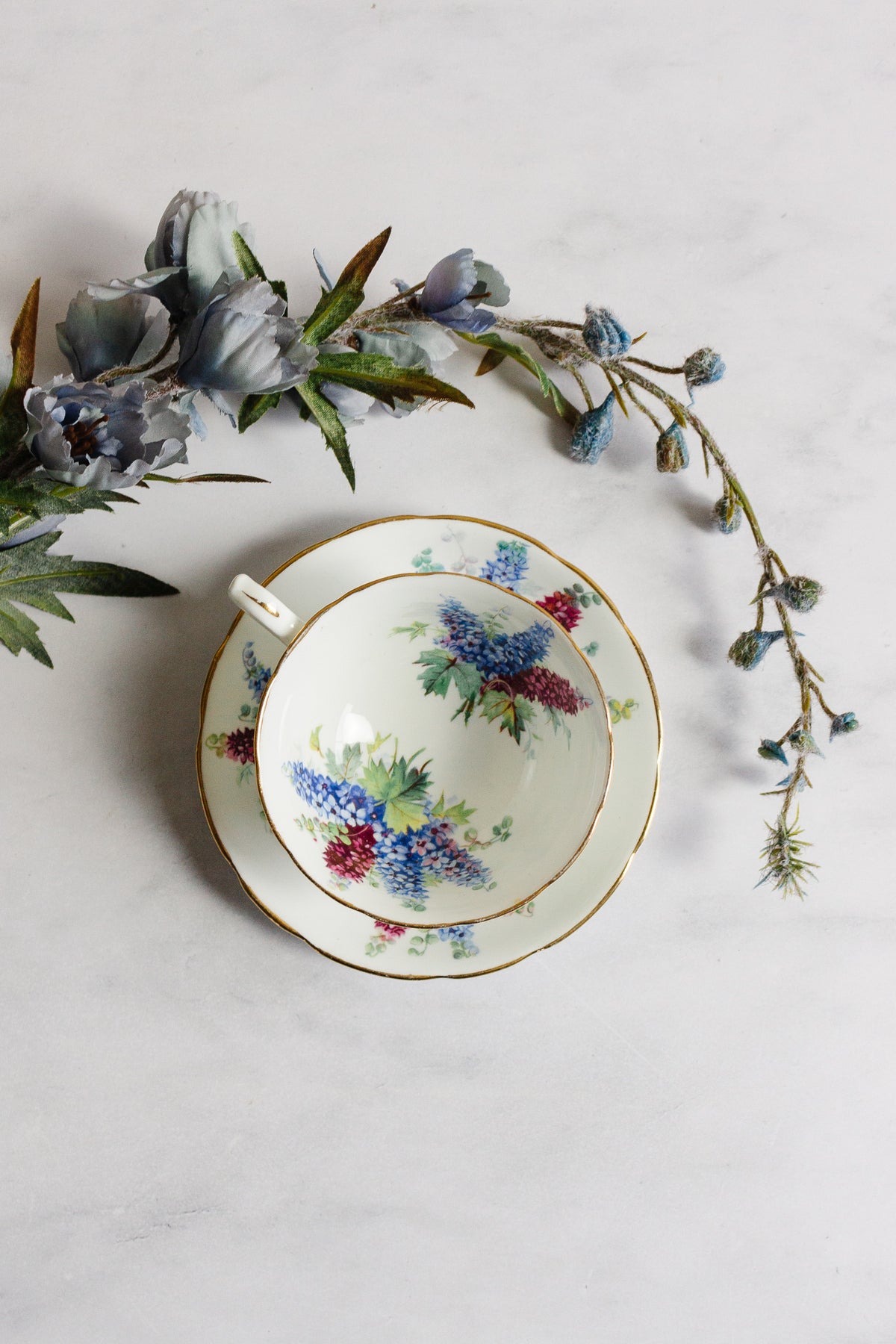 This antique Hammersley tea cup features hand painted lilacs with gold accents. Vintage teacups are beautiful,  useable, and highly collectible. Sourced from a home in Marseille.