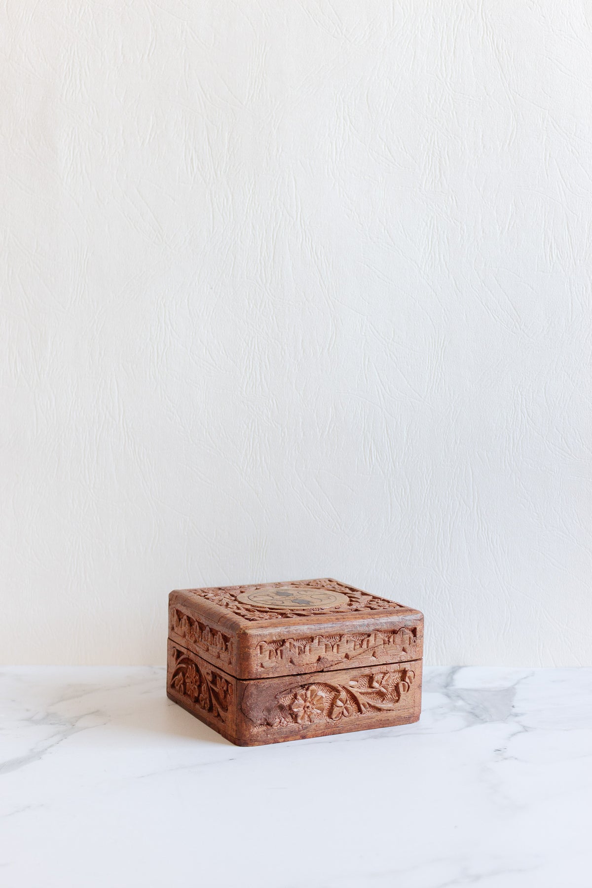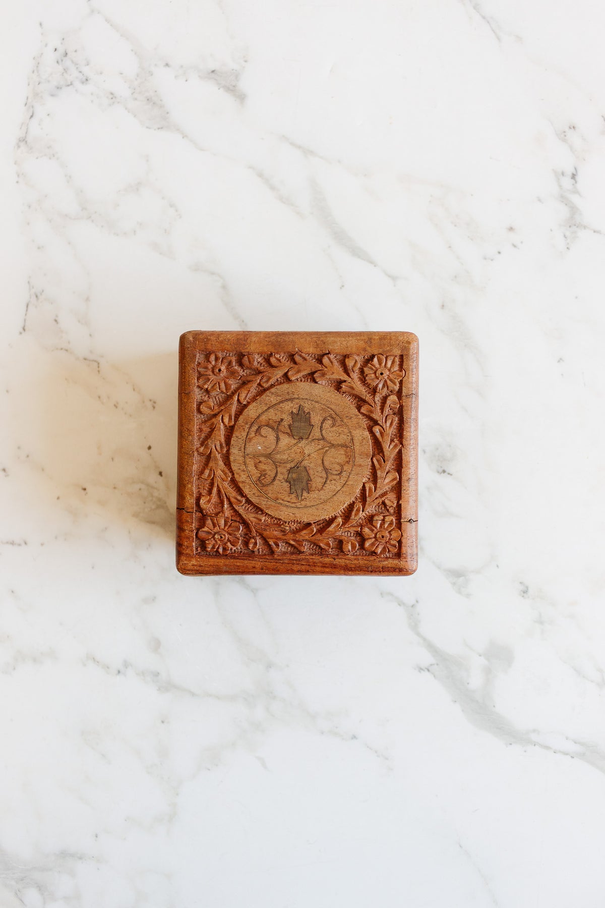 The wood box is small and square, featuring ornate floral carvings on its lid. Resting on a white marble surface, its compact size makes it ideal for storing keepsakes or jewelry.