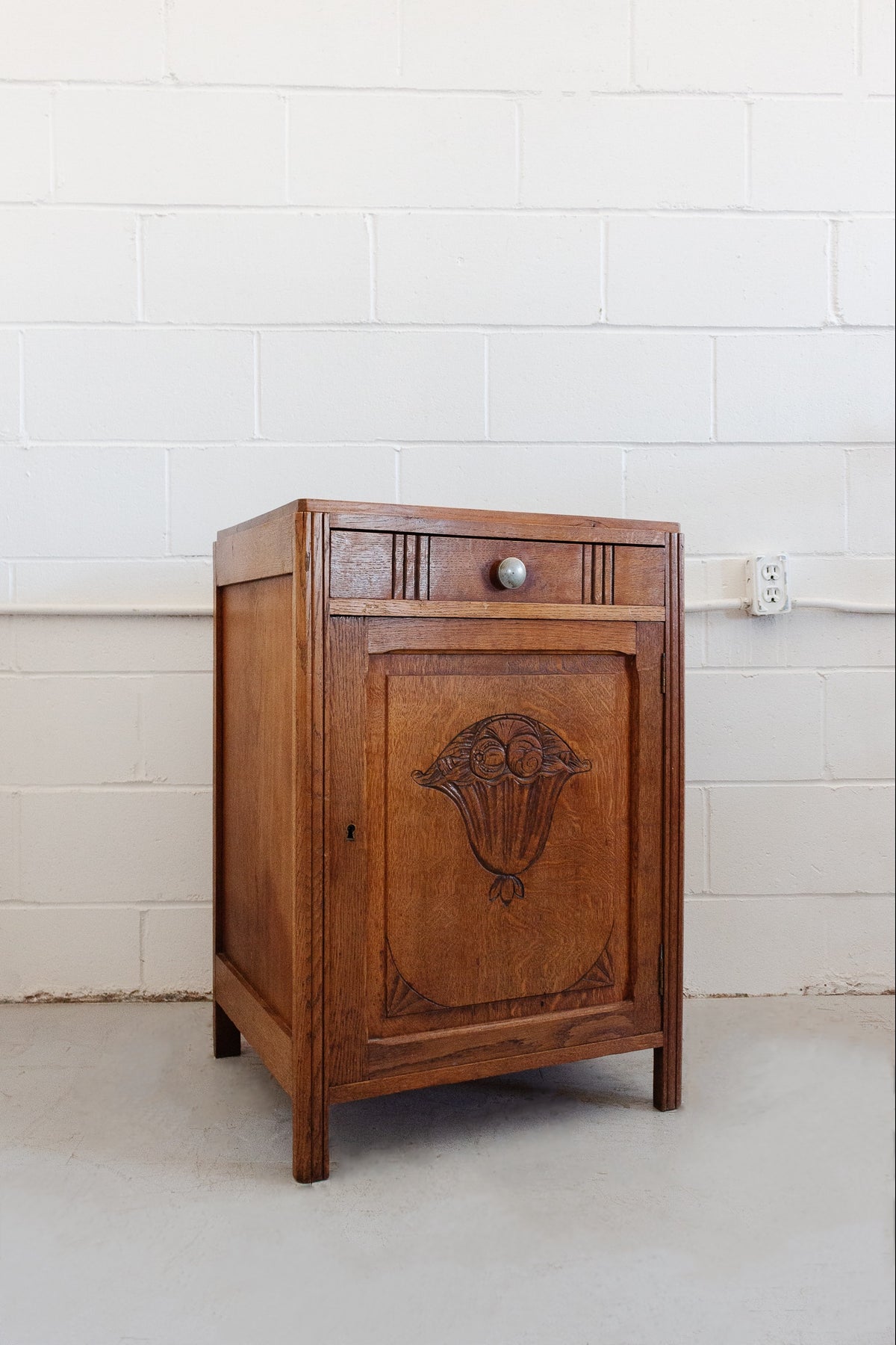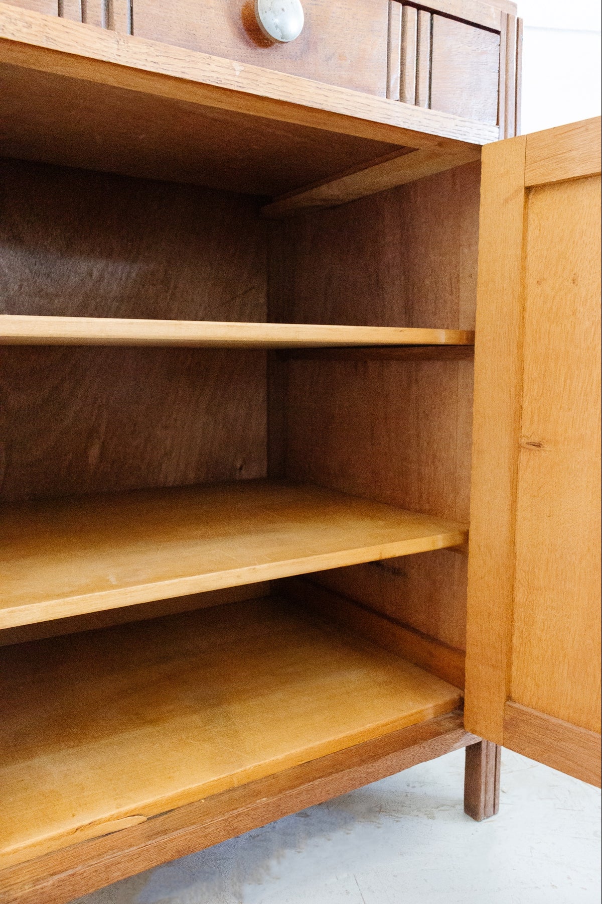 An absolutely stunning cabinet with clean lines and hand carved, art deco style details. With its 3 shelves, top drawer and ample storage room, it’s a perfect blend of form and function. In beautiful vintage condition, with some slight signs of superficial wear as pictured.